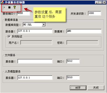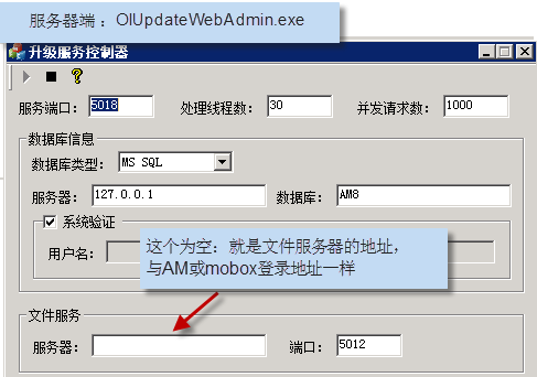 注解: 文件服務的服務器地址 (要求在局域網及外網都能訪問的IP地址)若有些用戶沒有外網,則就是內網能訪問的地址。 (一般我們的升級服務與AM8/Mobox的主服務都是在一臺機器上)參數更新后,需要重啟這個服務