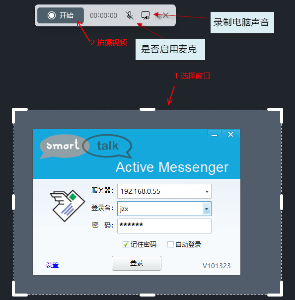 2、在屏幕中間出現,菜單選擇,錄視頻,選擇后,指定需要拍攝的區域,之后點擊開始
